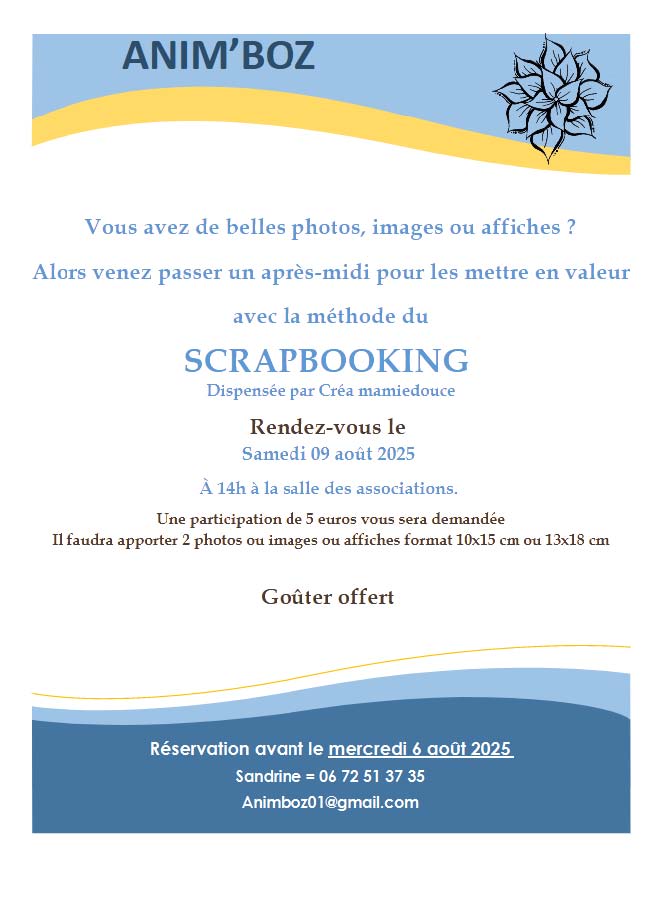 Samedi 9 août à 14h dans la salle des associations située sur le terrain communal, Anim’Boz propose une après-midi consacrée au scrapbooking.