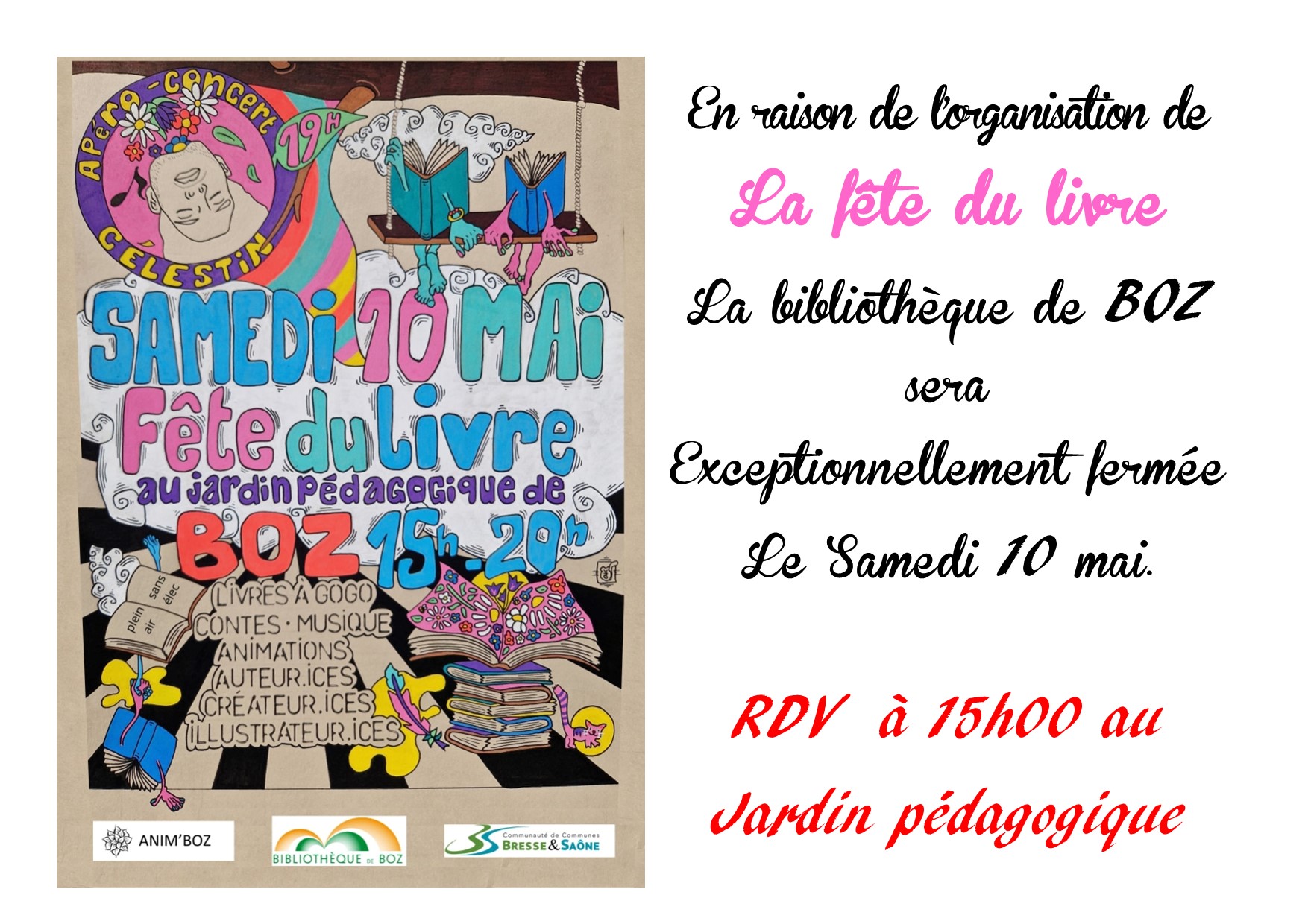 Samedi 10 mai, les bénévoles de la bibliothqèue organisent la fête du livre au jardin pédagogique de la commune.