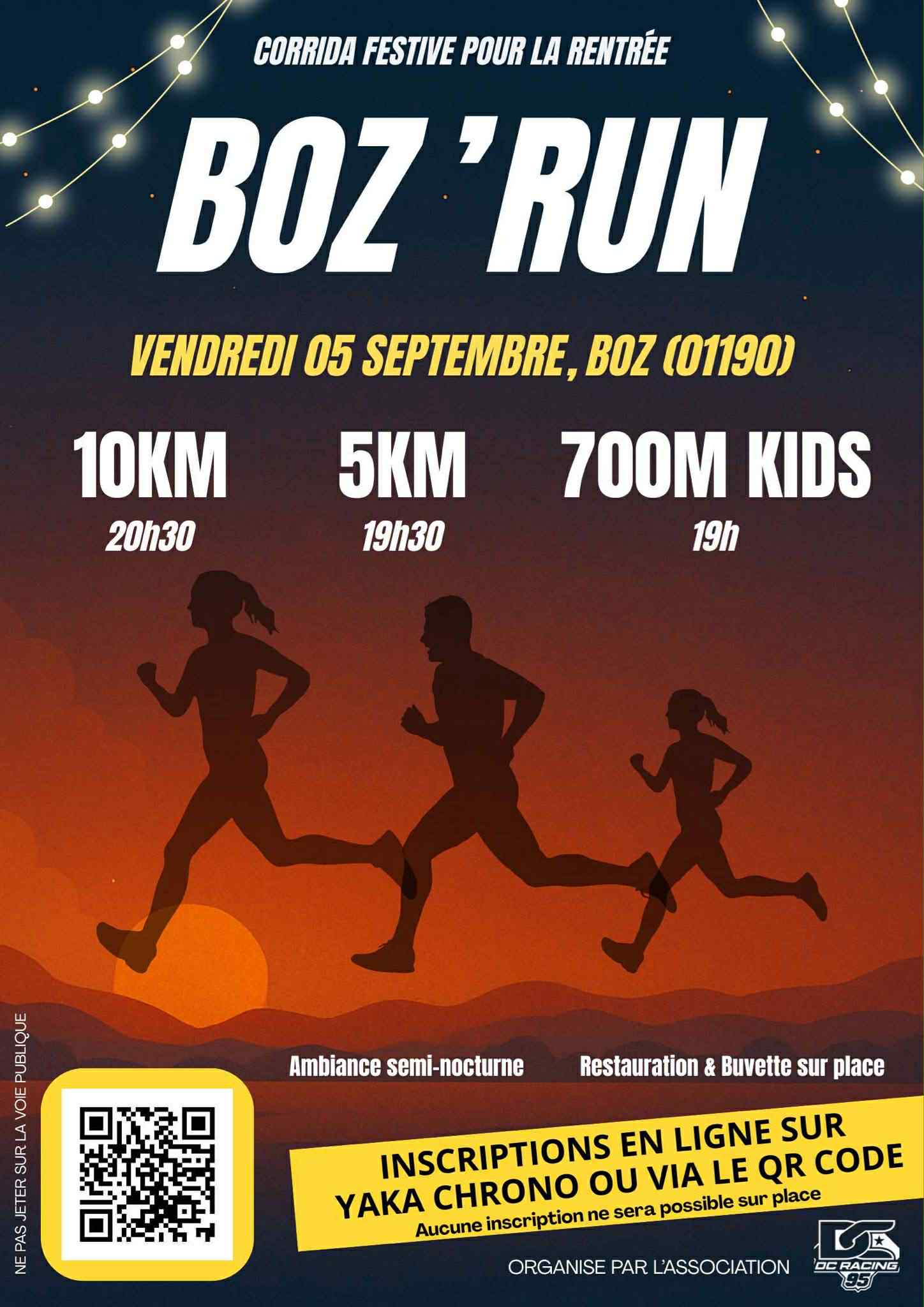 3 courses sont au programme : La Boz’Kids pour les enfants de 6 à 13 ans et sur une distance de 700 mètres. La Boz’5km sous le format Corrida (2 boucles de 2,5 km) et La Boz’10km, également au format corrida (4 boucles de 2,5 km). Les gagnants seront primés et il y aura des podiums jeunes. Les enfants repartiront tous avec des souvenirs de la course. Nous avons souhaité une ambiance festive et conviviale avec planche de charcuteries à partager, brasero.