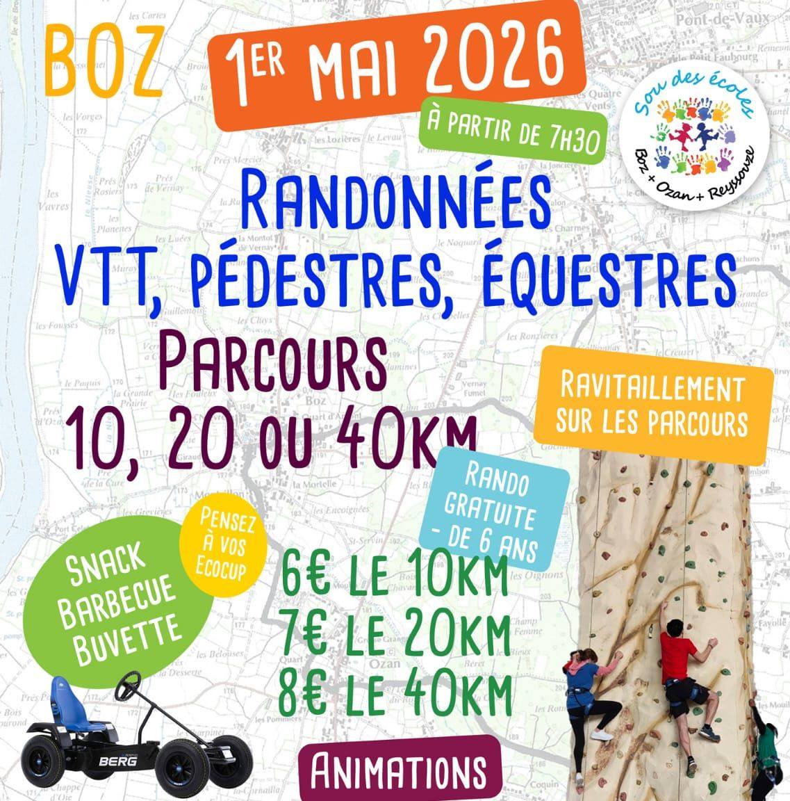 Pour ce vendredi 1er mai, les parents d’élèves ont donc préparé une belle fête à partir de 7h30. On y trouvera les traditionnelles randonnées. Pédestres, cyclistes et équestres, longues de 10, 20 ou 40 km, elles seront toutes dotées d’un ravitaillement. Chacun pourra ainsi passer un bon moment plus ou moins sportif.