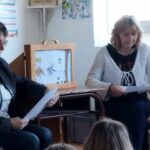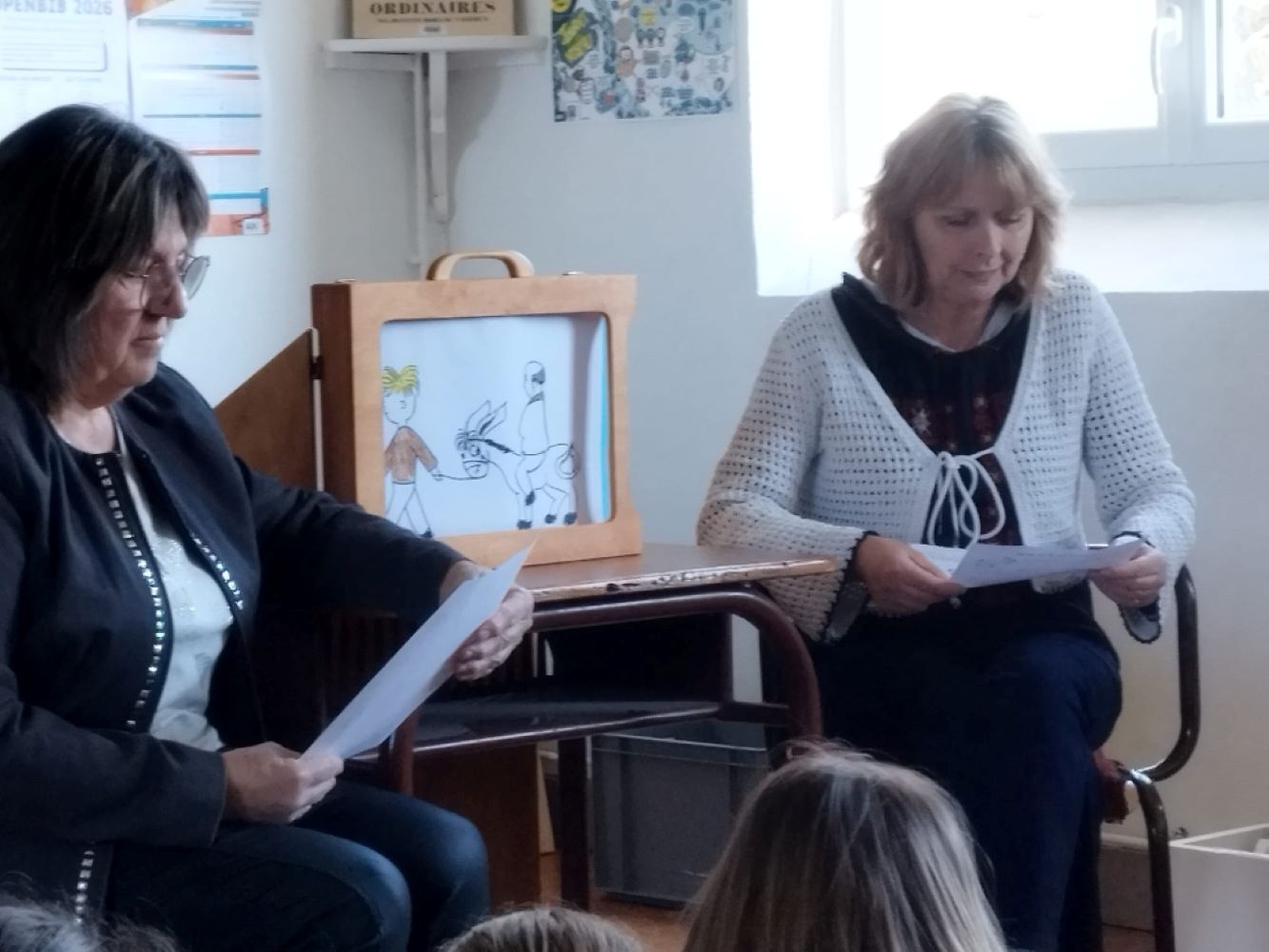 À l’aide d’un Kamishibaï, qui est un petit théâtre ambulant qui permet de faire défiler des illustrations en même temps que le récit, les narratrices leur ont conté un vieux conte Persan « L’éducation d’un sage ».