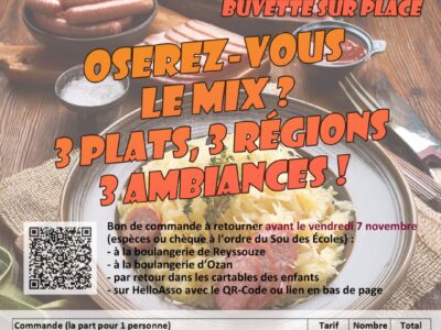 Associations, Sou des Ecoles Vente du Sou « 3 plats, 3 régions, 3 ambiances » 20 octobre 2025 — 43 vues— 0 commentaire Le sou des écoles du RPI Boz-Ozan-Reyssouze vous propose sa vente « 3 plats, 3 régions, 3 ambiances …