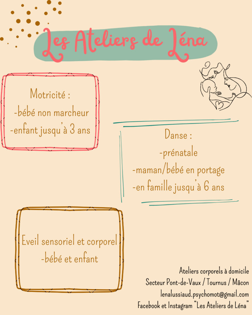 Lena Lussiaud est psychomotricienne diplômée depuis 2015 et a créé en septembre 2024 « Les Ateliers de Léna » pour proposer aux familles du secteur de Pont de Vaux, des ateliers corporels : Danse, éveil et motricité.